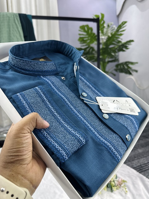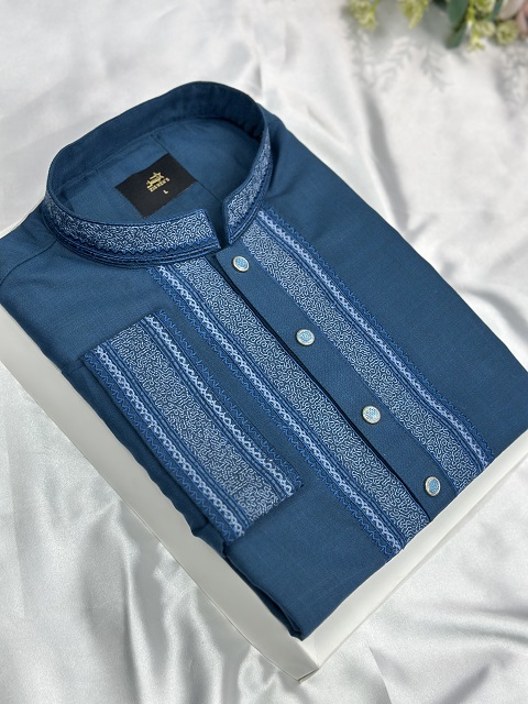 কলার ও প্লাকেট ডিজাইন: পাঞ্জাবিটির প্রধান আকর্ষণ এর চায়নিজ কলার (Mandarin Collar) এবং বুকের সামনের অংশে করা সূক্ষ্ম এমব্রয়ডারি কাজ। জ্যামিতিক নকশার এই কারুকাজটি অত্যন্ত নিখুঁতভাবে করা হয়েছে, যা পাঞ্জাবিটিকে একটি রাজকীয় লুক দেয়।