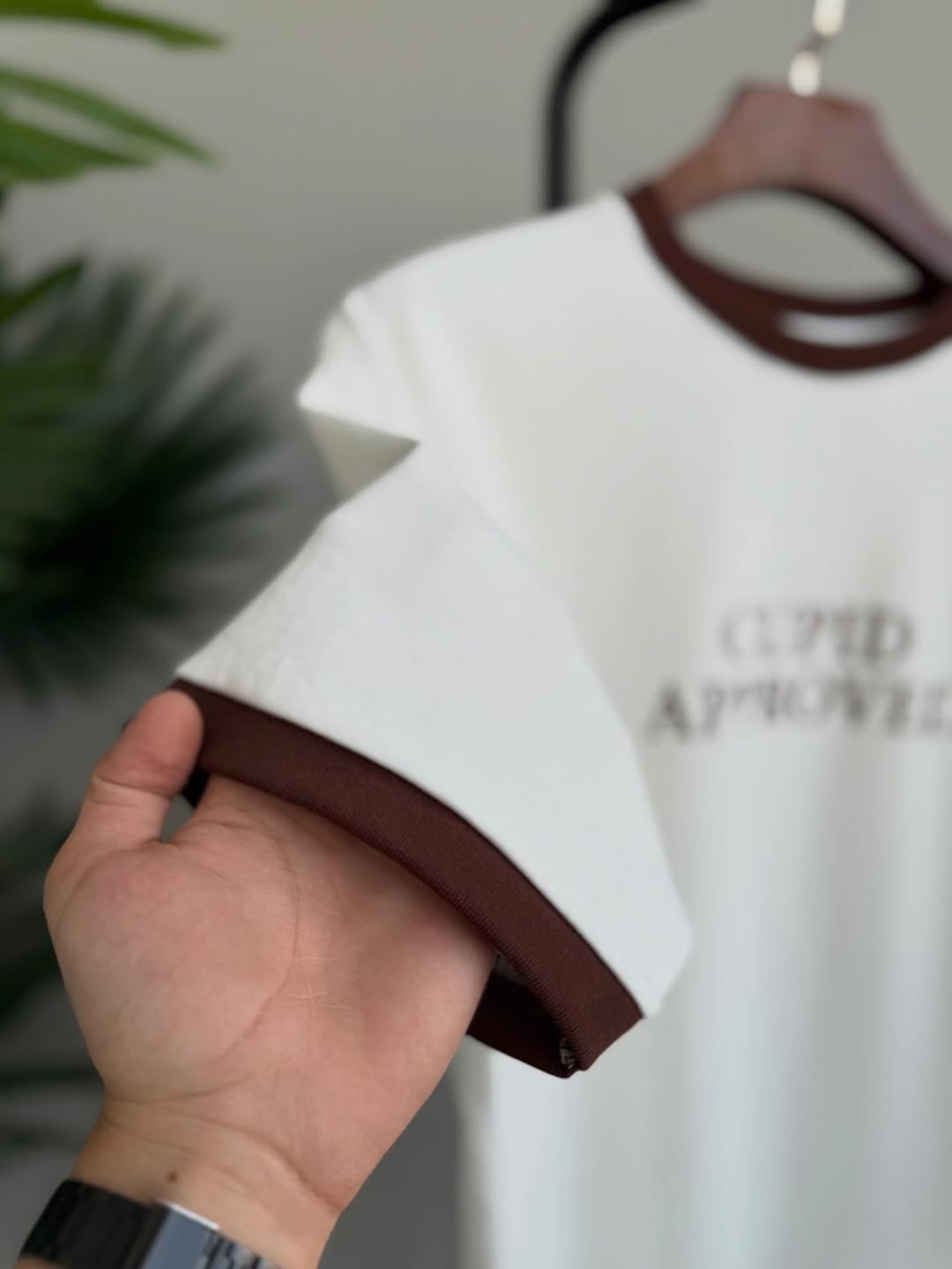 Design: A crisp white base highlighted with premium chocolate brown accents on the crew neck and cuffs.
